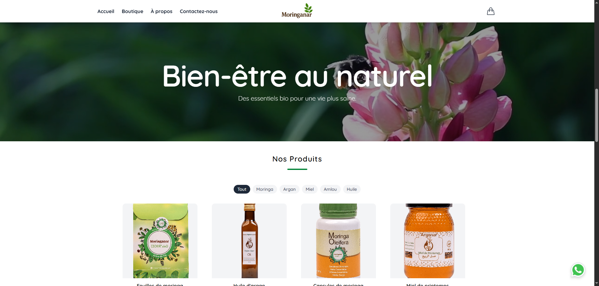 Moringanar is an e-commerce brand operating in the natural health, organic food, and beauty products sector in Morocco. The business is built around promoting the benefits of natural products, especially Moringa (sold as powder, capsules, and oil) and Moroccan essentials like 100% organic Argan oil, pure honey, and traditional Amlou (almond, honey, and argan oil spread). Moringanar emphasizes product purity, quality assurance, authenticity, and local sourcing, positioning itself as a reliable source for natural essentials for well-being, beauty, and diet.